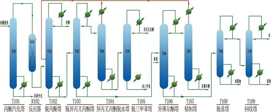 针对异佛尔酮的生产现状 , 我公司与中国石油大学(华东)联合开发了丙酮直接缩合的气固催化合成技术,该工艺以先进的丙酮气相催化缩合反应技术为基础 , 采用共沸与萃取精馏分离技术分离反应产物,得到异丙叉丙酮、均三甲苯和异佛尔酮产品,填补了国内技术空白。